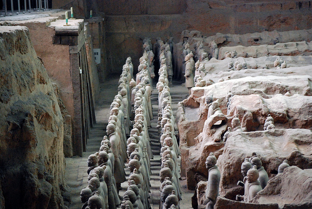 Qin Shi Huang quería un ejército que protegiera su tumba después de muerto. Tal vez por ello las figuras están en posición de batalla, distribuidas en tres fosos. Figuras que se fueron enterrando y que quedaron en el olvido durante siglos.