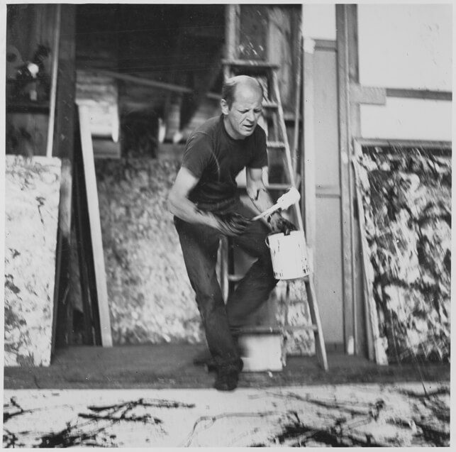 Entre 1946 y 1947 algo evoluciona. Las leyendas hablan de un accidente y de un bote de pintura que se derramó en el lienzo. Pero lo cierto es que Pollock comienza a colocar sus telas de gran tamaño en el suelo del granero y lanza chorros y gotas de pintura, arena y cualquier elemento para dar textura.